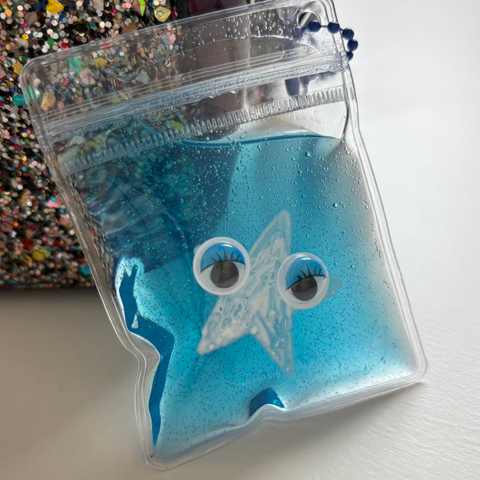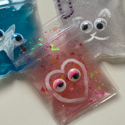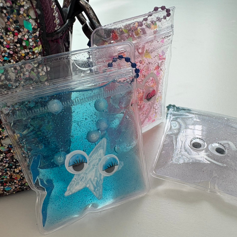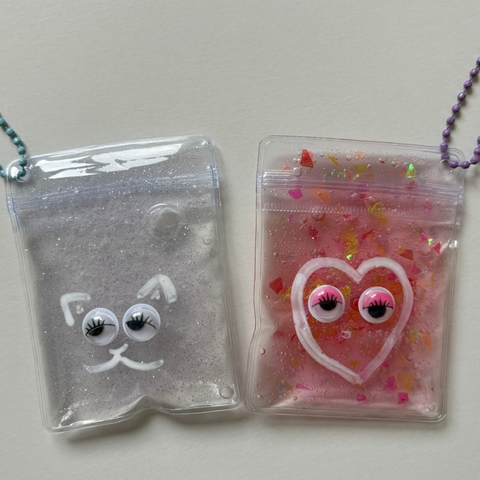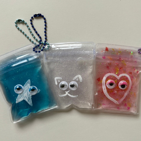 手づくりスライムをキーホルダーバッグにして、きょろきょろ目玉を付けたり、キラキラペンで描きこんだりしてぷにぷにキーホルダーを完成させよう。